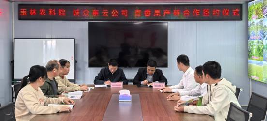 2025年3月10日,玉林市农业科学院党委书记、院长傅兵与广西诚众东云农业科技有限公司董事长陈宜湧签订了产研合作协议,同时在新圩镇旺山村的诚众东云百香果种苗基地开展“百香果产研合作示范基地”、“玉林市农业科学院百香果研究基地”的揭牌仪式。玉林市农业科学院党委副书记,副院长黄金勇及该院百香果课题组骨干人员参加当日揭牌仪式。