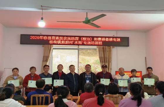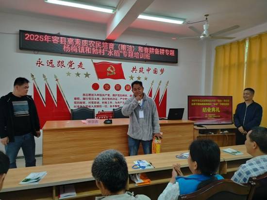 4月18日,由容县农业农村局主办、广西制造工程职业技术学院承办的“2025年容县高素质农民培训班”结业典礼在容县各乡镇村委会教室举行。全县各乡镇春耕备耕专题菜篮子工程,水稻和玉米种植大户等450多名学员完成培训任务,顺利取得结业证书。县农业农村局相关股室领导出席典礼并致辞。