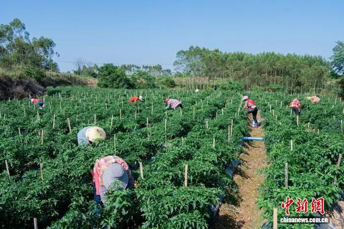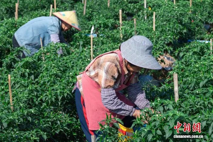 近日,广西玉林市兴业县高峰镇上河村辣椒种植基地迎来丰收季。连片椒田里,饱满翠绿的“椒中玉”缀满枝头,村民们正有条不紊地进行采摘、分拣等作业。这些新鲜辣椒将发往中国各地市场,以优质品质抢占消费先机。