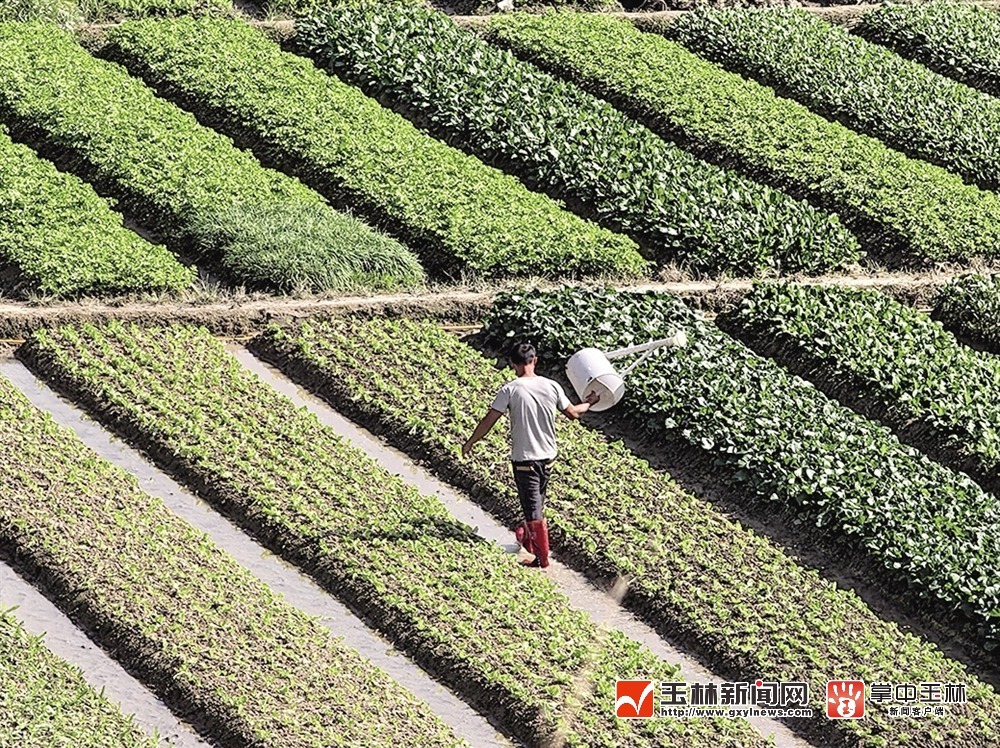 初冬时节,玉林大地冬种忙,村民们在田间开始了与土地的新一轮“对话”。11月13日,在玉州区城北街道蔬菜种植基地,农户们在地里忙着除草、施肥,或为菜苗盖上薄膜保暖……一垄垄整齐的田畦,如绿色的丝带,在冬日暖阳下熠熠生辉。欢声笑语伴着忙碌的身影,仿佛正在田野间奏响一支冬种的欢快乐曲。图为农户给菜苗施肥。