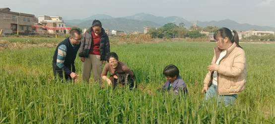 当日下午,深入北流市塘岸镇、山围镇,陆川县平乐镇,玉州区仁厚镇等冬小麦种植基地,与农业服务中心工作人员、种植户深度对接,实地核查各基地种植规模、地形地貌、水源保障,细致查看冬小麦生长长势,全面了解基地播种时序、水肥调控、病虫草害绿色防控等关键技术落实情况,结合各基地生产实际特点,逐一给出针对性强、可落地的指导意见和建议。本次座谈与调研对我区“稻-稻-麦”多熟制的发展具有重要的推动作用。
