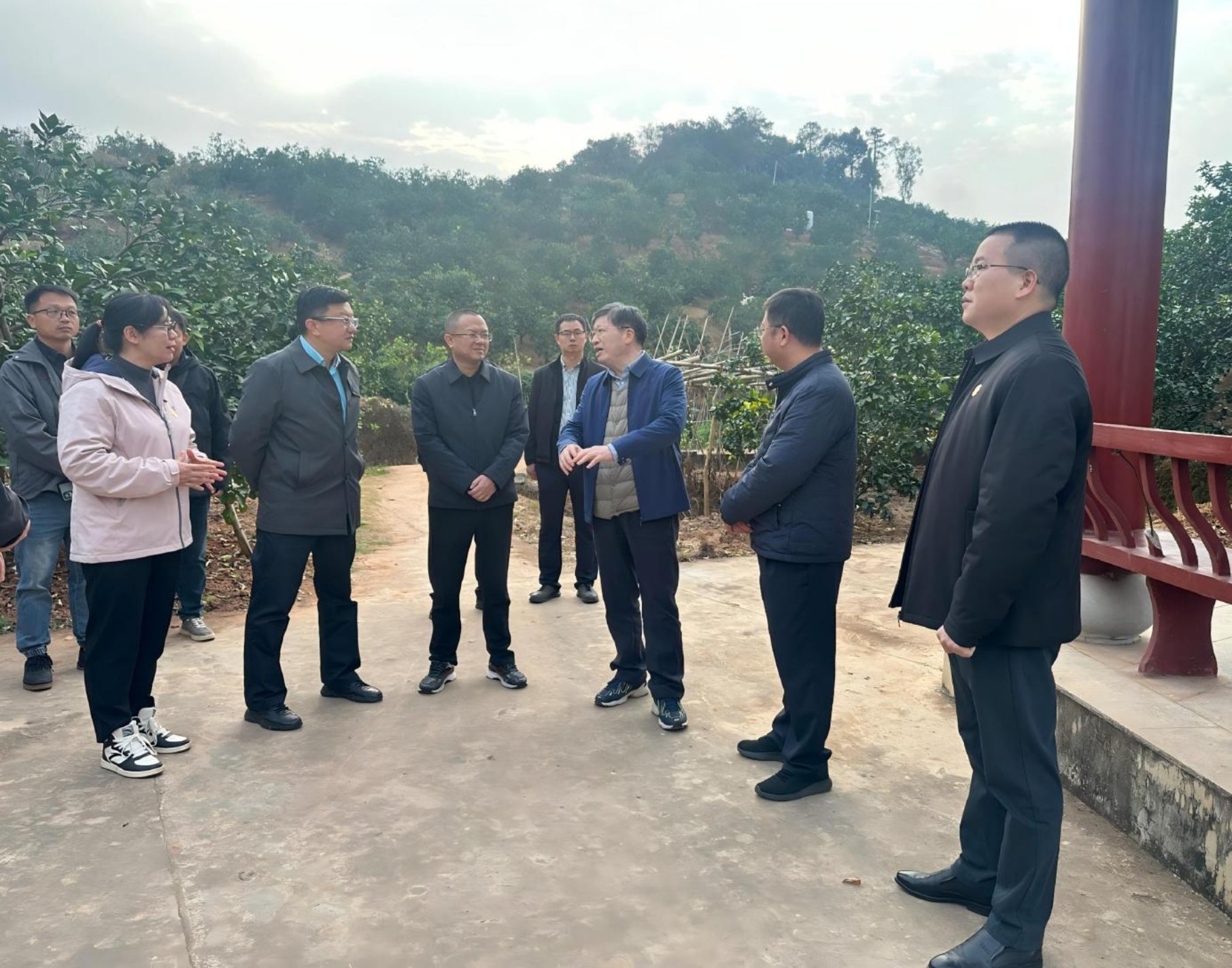 调研期间,邓秀新副院长(右三)在自治区农业农村厅副厅长韦波(左三)和玉林市人民政府副市长马少华(左四)等陪同下到容县沙田柚高效栽培示范基地(容州镇千秋村)进行调研。